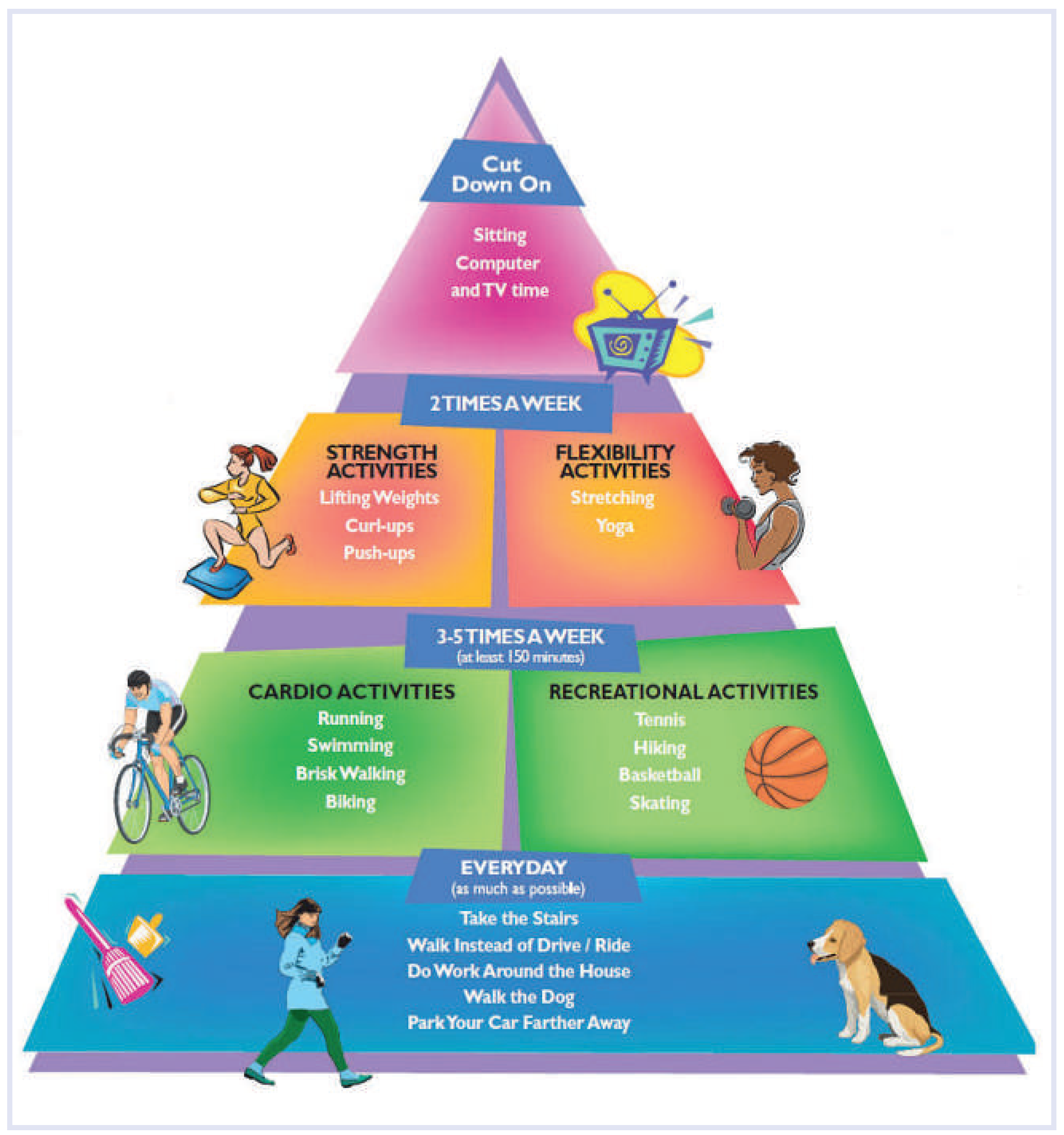 - Introduction of the “activity pyramid” as a general rule for exercise prescription, using a concept similar to the food pyramid in order to provide an easy method to advocate physical activity (Figure 1).