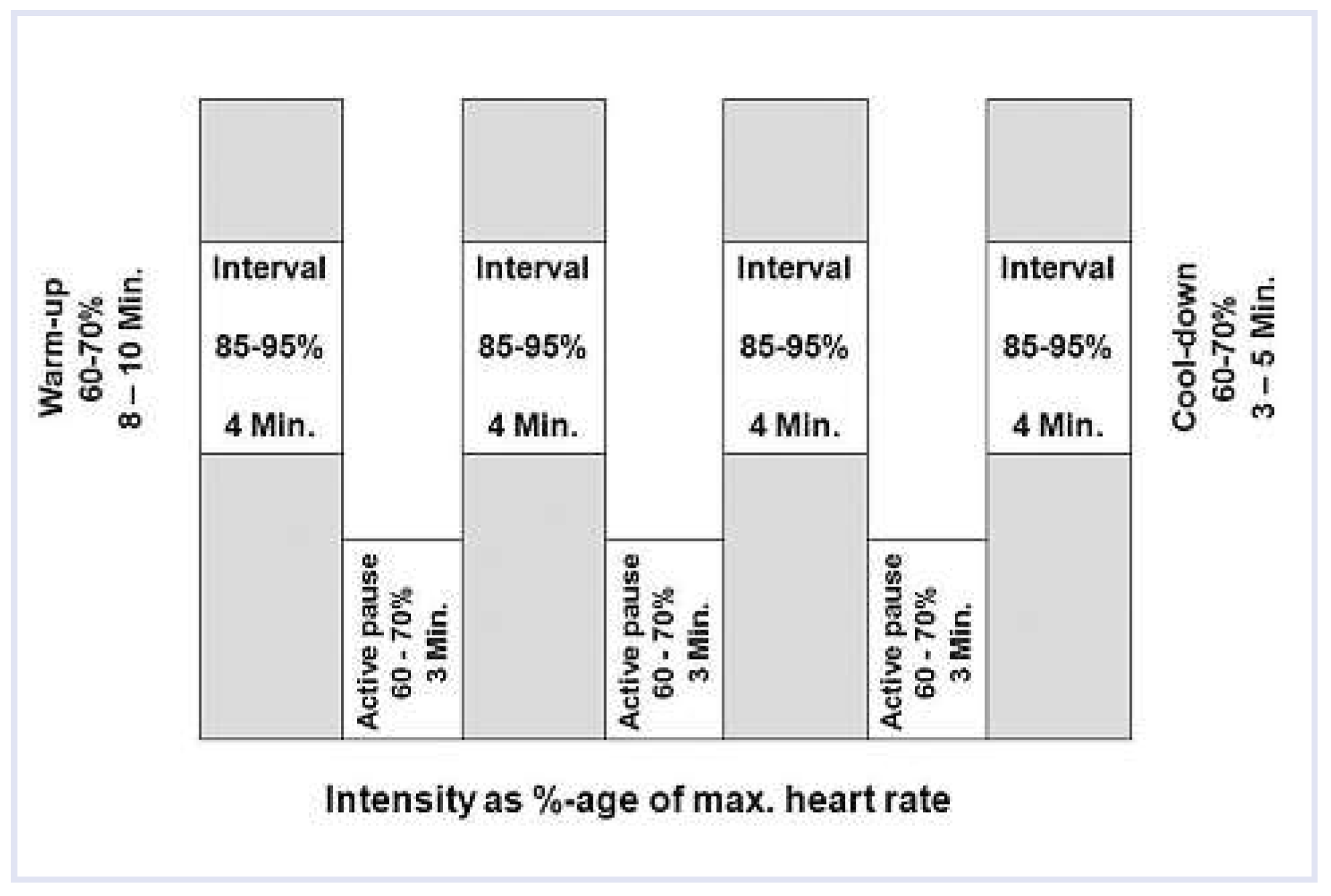 - High intensity interval training (bouts of 90 to 100% of heart rate reserve) vs. lower intensity, interspersed with rest (minimal threshold) for equal time periods.