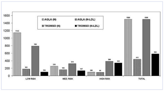 Conclusions: Achieving LDL ≤1.8 mmol/l would be the single most important intervention in lowering coronary risk by 50%. In reaching all AGLA goals, the predicted 10-year risk would fall from 13–7% in COR and from 16–8% in KAR. Subjects are predominantly at low risk according to AGLA, at intermediate risk after reclassification, and could become true low risk through intensified intervention.