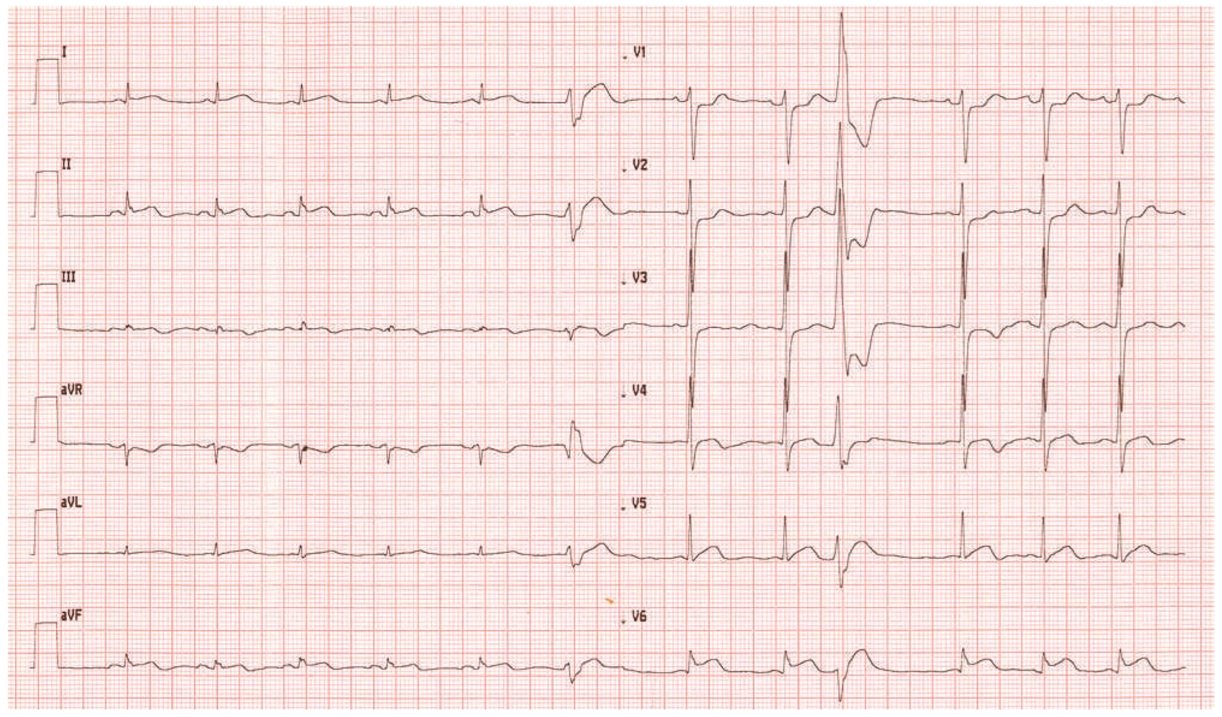The ECG at admission showed normal sinus rhythm and ST-segment changes in the infero-lateral and the antero-septal leads (