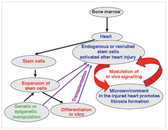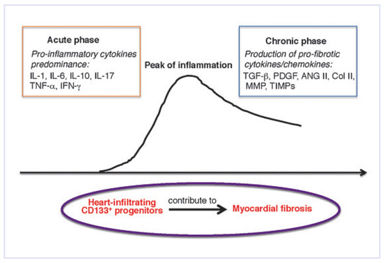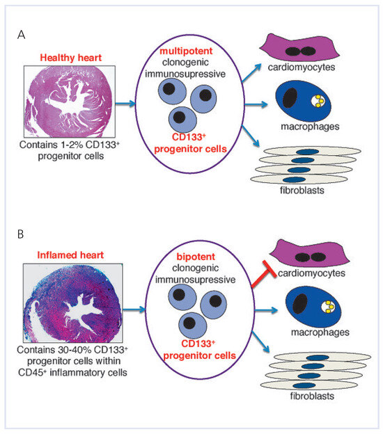 Understanding the pathways that chauffeur pathological remodelling in the failing heart still remains challenging. Myocardial inflammation is a common cause of pathological tissue remodelling in the heart promoting development of heart failures, often with the phenotype of inflammatory dilated cardiomyopathy. Pathological remodelling is associated with replacement of native cells by fibrotic tissue that reflects poor clinical prognosis and a stage of irreversibility. Substantial efforts have been attempted to develop therapeutic strategies aiming to regenerate the injured heart with stem cells. There is, however, increasing evidence that stem cells modulate inflammatory processes in damaged hearts acting in a paracrine fashion rather than directly regenerating cardiac tissue. The recent findings suggest that the poor effectiveness of stem-cellbased therapies in heart diseases is a result of the nonphysiological microenvironment of the affected cardiac tissue. In particular, the inflamed myocardium inhibits the cardio-regenerative capacity of transplanted stem cells, and instead promotes the pro-fibrotic processes. A growing body of evidence suggests that the specific signalling milieu of the affected heart is a key determinant of the fate and function of stem cells in the myocardium. Therefore, coupling the modulation of the myocardial microenvironment with patient-specific stem cells must be considered to achieve successful stemcell-based therapy in heart disorders. This review shortly summarises the current knowledge about the role of stem and progenitor cells in inflammatory cardiomyopathy and their potential use in stem-cell-based therapies. Full article