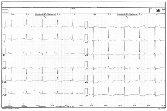Patient 1: Electrocardiogram revealing severe ST-segment depression in I, aVL, V4–V6.