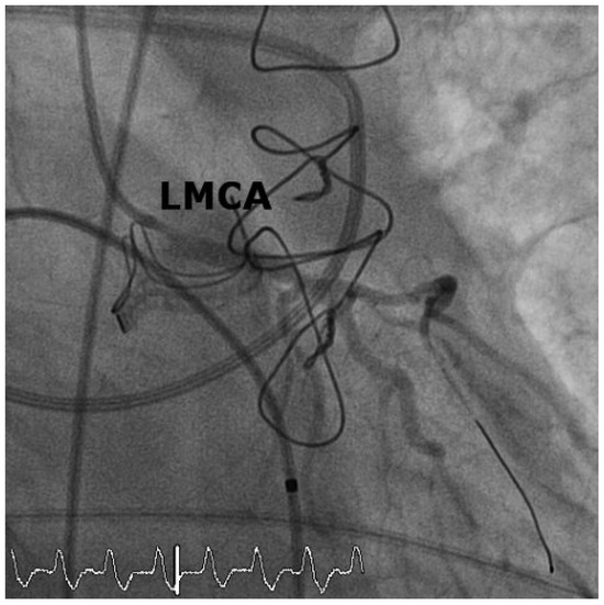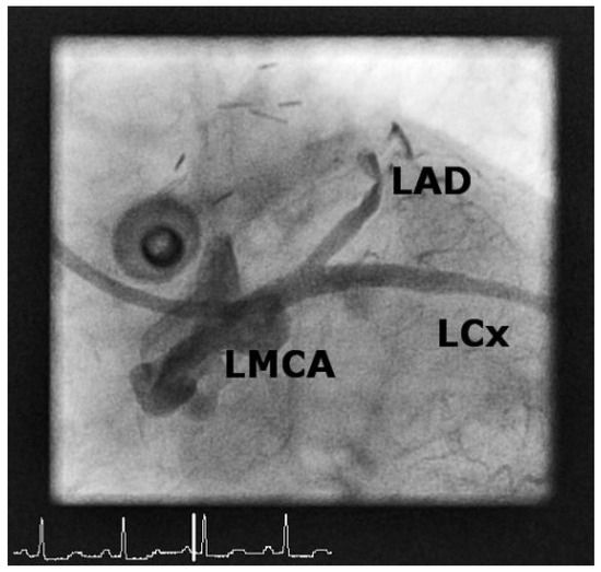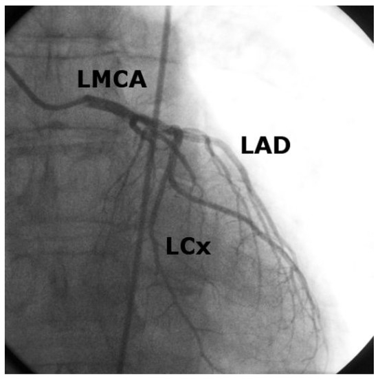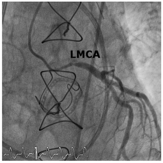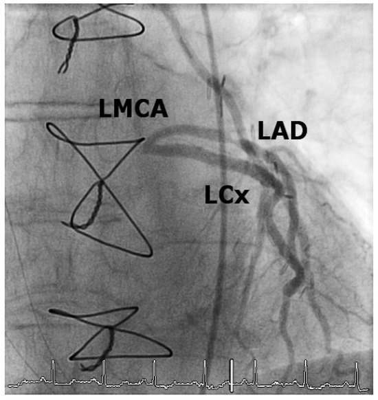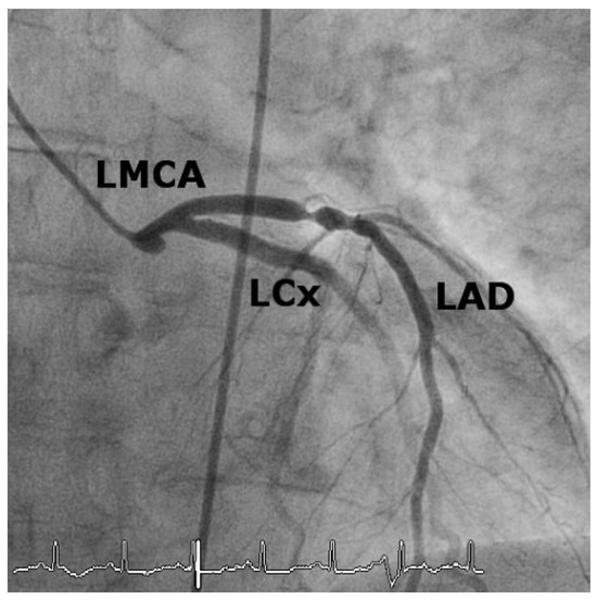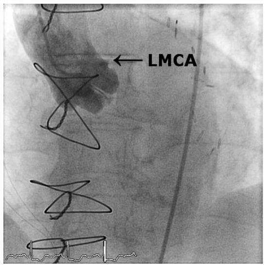 Patient 2: Coronary angiogram after percutaneous coronary intervention and drug-eluting stent implantation of the main stem lesion. LMCA = left main coronary artery.