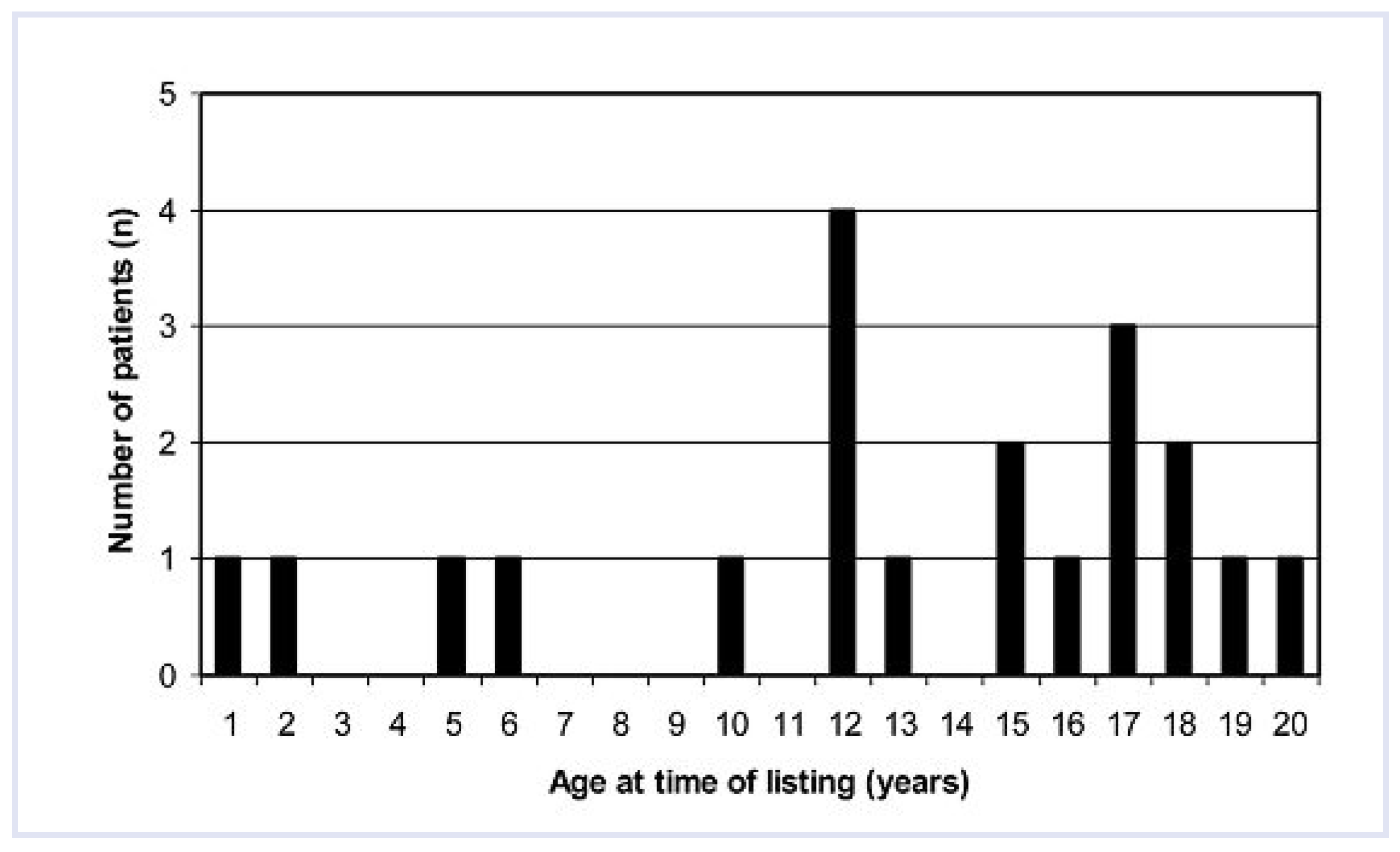 A total number of 20 patients younger than 20 years were listed at our institution during the study period of 15 years. There were 8 female and 12 male patients, and the median age at the time of listing for transplantation was 13.8 years (range 1–19.6). There was an asymmetric age distribution with only 4 patients aged 10 years or less (