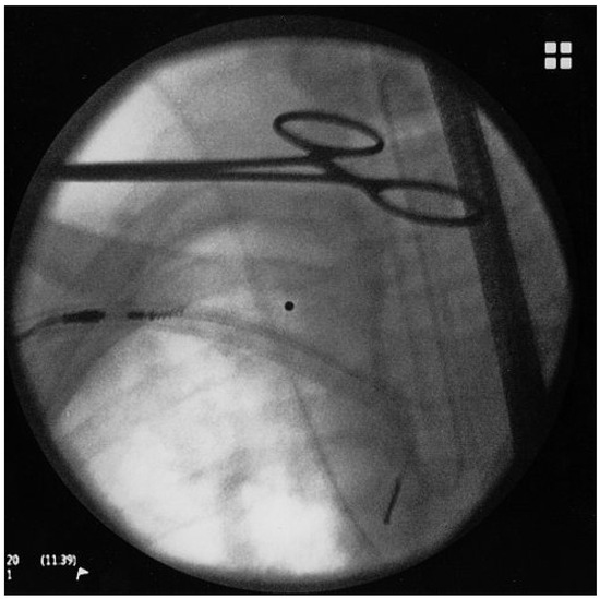 On this fluoroscopy picture, the two leads can be seen together within the mechanical dilatator. Special care was taken to stop the liberating manoeuvre once the blade reached the area where the leads separated. The entire procedure was done under fluoroscopy.