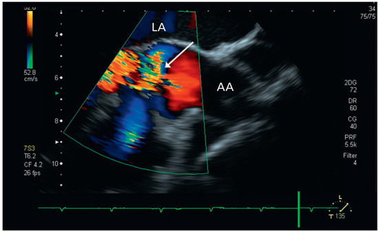 Diastolic frame of the aortic valve and the aorta in long axis TEE view with colour Doppler showing severe aortic insufficiency (arrow).