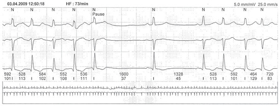 Der 70-jährige Patient wurde uns zugewiesen zur stationären kardialen Rehabilitation bei St. n. mechanischem Aortenklappenersatz wegen schwerer degenerativer Aortenstenose. Wegen ungerichtetem Schwindel wurde im Verlauf der Rehabilitation ein 24-h-EKG durchgeführt mit der Frage nach Auftreten von Vorhofflimmern. Das Telemetrie-EKG konnte folgende Rhythmusstörung dokumentieren (Abb. 1):