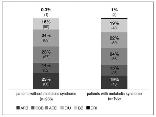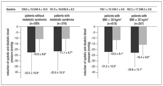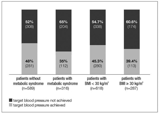 p = 1.0/0.8) in patients with (–22.0 ± 15.3/–11.1 ± 8.7 mm Hg) and without metabolic syndrome (–22.0 ± 15.8/–10.9 ± 9.6 mm Hg), while target blood p ressure attainment was significantly lower in patients with metabolic syndrome (35% vs. 48%;