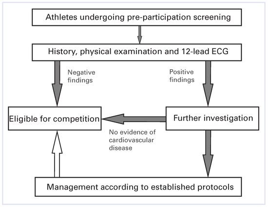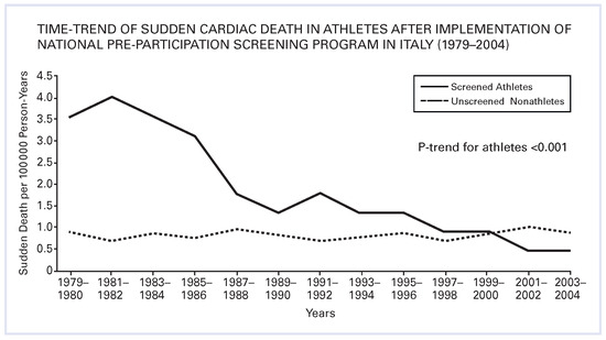 Sudden cardiac death (SCD) in athletes i s a rare but highly tragic event. The majority of SCDs in young athletes are attributable to inherited or congenital cardiac disorders. Athletes harbouring such potentially fatal conditions may remain asymptomatic and sudden death is frequently the first presentation. Most implicated disorders are identifiable during life, and a variety of therapeutic options are available to minimise the risk of SCD. Whereas most health professionals advocate pre-participation cardiovascular screening (PPS) on humanitarian and medical grounds, there is controversy about the most cost-effective method of screening. The American screening model encompasses a cardiovascular health questionnaire and physical examination, while in Italy a mandatory national screening programme is in existence that also incorporates 12-lead ECG. The American model is cheap and pragmatic but has poor sensitivity for the identification of sinister cardiac disorders. In contrast, the Italian model has been shown to exhibit a high sensitivity and specificity for the detection of cardiomyopathies, and has been associated with a dramatic reduction in the incidence of SCD since its inception. However, there are concerns regarding the cost-effectiveness of large-scale ECG screening programmes driven by false positive results and costs of unnecessary additive investigations to confirm or refute the presence of a serious disorder. Nevertheless, major sporting and cardiac organisations have endorsed and advocated the ECGbased screening protocol, which currently remains the most feasible and cost-effective method of pre-participation screening. More efforts are required to address some pertinent issues regarding the universal implementation of PPS programmes. Full article