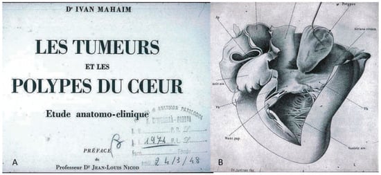 The front page of the first book on cardiac tumours by Ivan Mahaim, published in 1945 [2] (A) with the original drawing of the left atrial myxoma (“le polype du coeur”) (B).