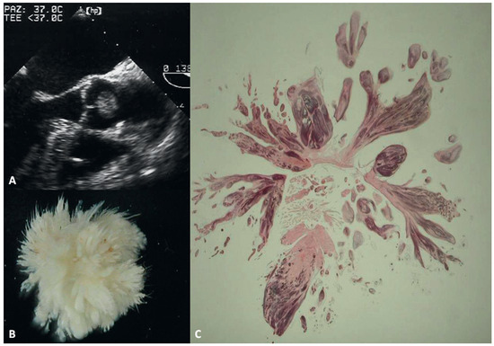 Papillary fibroelastoma, known also with the name of endocardial papilloma, is the second primary cardiac tumour following myxoma in our series (8%) [17] and it is the most common primary heart valve tumour [28,29,30] (Figure 4). Gowda et al. reviewed 725 cases of cardiac papillary fibroelastoma reported in the literature, and found that the valvular endocardium was its predominant location [31]. More than 95% arise in the left heart. The aortic valve (29%), mitral valve (25%), tricuspid valve (17%) and pulmonary valves (13%) are involved [31,32], but also the mural non-valvular endocardium may be the site of growth, in the latter case being difficult to differentiate from thrombus and myxoma. It is predominant in the 4th and 5th decades of life and in males [31]. On gross examination, it is a small intra-cavitary neoplasm usually single, firm, with a short pedicle and multiple papillary fronds similar to a sea anemone when under water [33]. At histopathology, it is a papillary lesion with a thin layer of mucopolysaccharide matrix and avascular stroma composed predominantly of elastic fibres and a small amount of collagen, covered with a single layer of endothelial cells (Figure 4) [34]. Recent or organised thrombi may be observed, entrapped within the fronds, having the potential to lead to thrombo-embolic events.