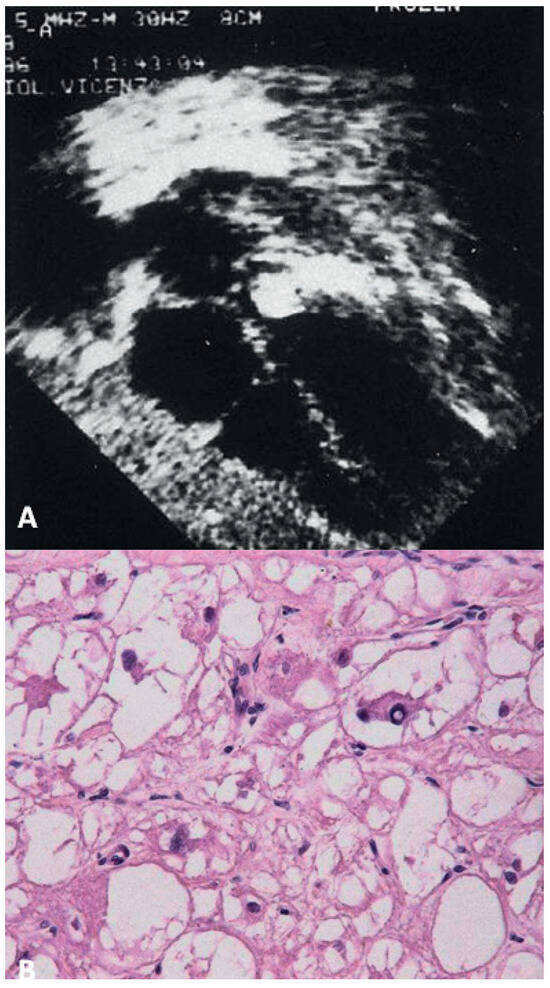 Rhabdomyoma in a 7-month-old male infant with systolic murmur. (Modified from: De Dominicis E, Frigiola A, Thiene G, Menicanti L, Bozzola L, Finocchi G. Subaortic stenosis by solitary rhabdomyoma. Successful excision in an infant following 2D echocardiogram and doppler diagnosis. Chest. 1989;95:470–2. © 1989 American College of Chest Physicians.) (A) 2D echocardiography reveals a sub-aortic endocavitary round mass. (B) The resected mass resulted to be a rhabdomyoma: note the typical “spider” cells (haematoxylin-eosin stain).