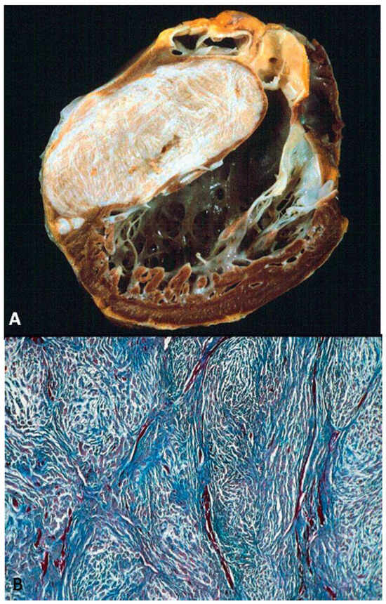 Cardiac fibroma in a 40-year-old woman who underwent to cardiac transplantation due to congestive heart failure with a misdiagnosis of hypertrophic cardiomyopathy with sub-aortic obstruction. (Modified from: Valente M, Cocco P, Thiene G, et al. Cardiac fibroma and heart transplantation. J Thorac Cardiovasc Surg. 1993;106:1208–12. © 1993 reprinted with permission from Elsevier.) (A) Long axis section of the native heart reveals an intramural huge, firm, white, oval mass and two satellite small nodules within the interventricular septum. (B) The mass at histology consists mostly of collagen bundles (Heidenhain trichrome stain).