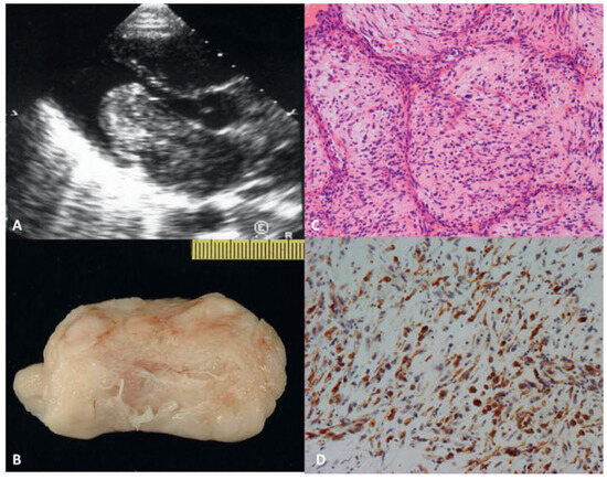 Left atrial malignant pleomorphic fibrous histiocytoma in a 68-year-old man with fever and fatigue. (From: Thiene G, Valente M, Lombardi M, Basso C. Tumours of the Heart. In: Camm JA, Luscher TF, Serruys PV, eds. ESC Textbook of cardiovascular Medicine. Oxford: University Press, 2009. © Oxford University Press.) (A) 2D trans-oesophageal echocardiography shows a round, non infiltrating, intra-cavitary mass in the left atrium. (B) Gross view of the resected mass: note the rough surface and non-gelatinous appearance. (C) At histology, bizarre, pleomorphic cells, frequently giant multinuclear, with high mitotic activity are visible. (D) Immuno-histochemistry points to an undifferentiated mesenchymal cell (vimentin positivity).