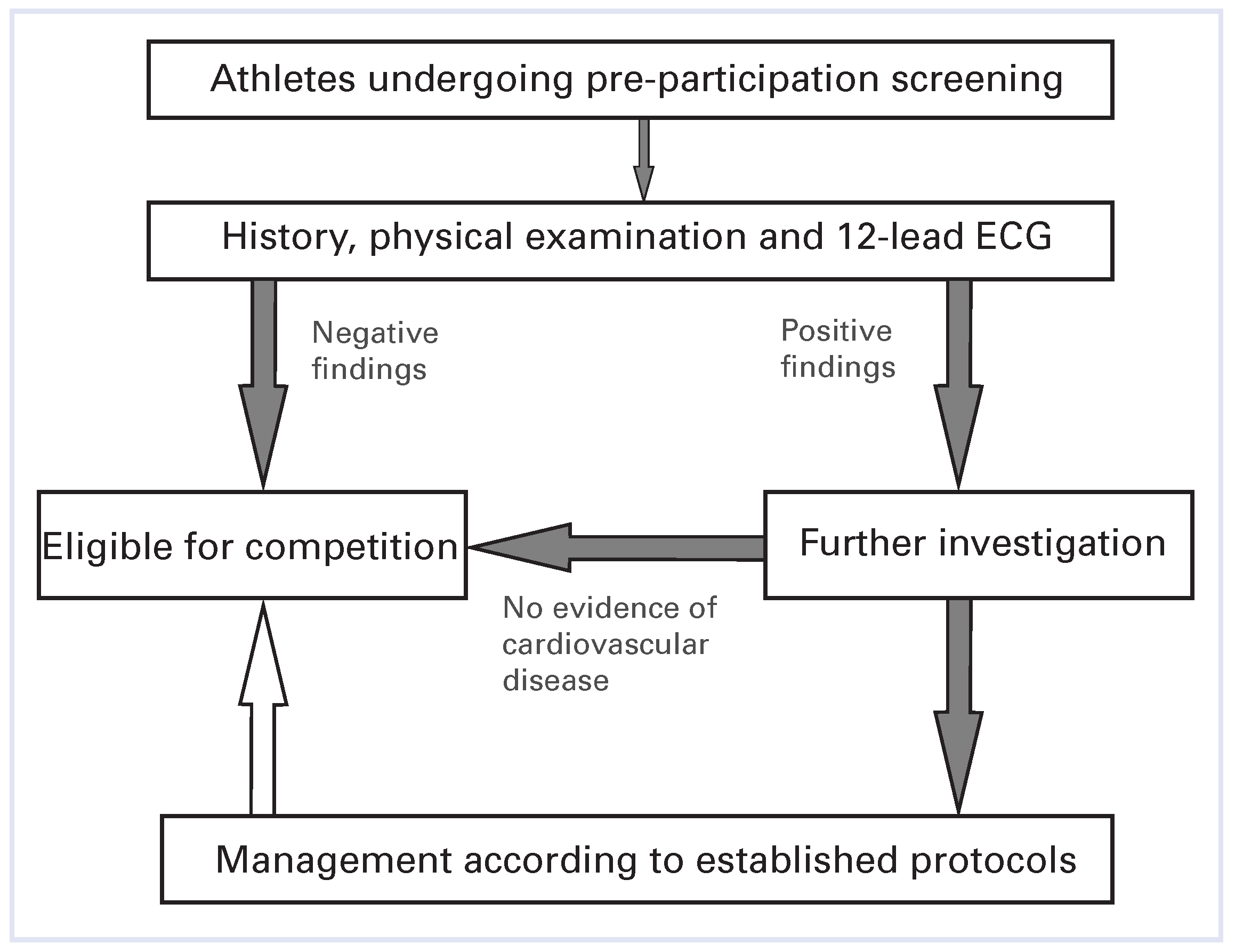 Pre-participation cardiovascular screening including ECG is effective in identifying cardiac disorders in young athletes, and has resulted in a reduced incidence of SCD. Major sports and cardiac organisations advocate PPS. Recent studies suggest that false positive rates are lowered in an expert setting and ECG screening is more cost-effective than contemporary evaluation with health questionnaire and physical examination alone.