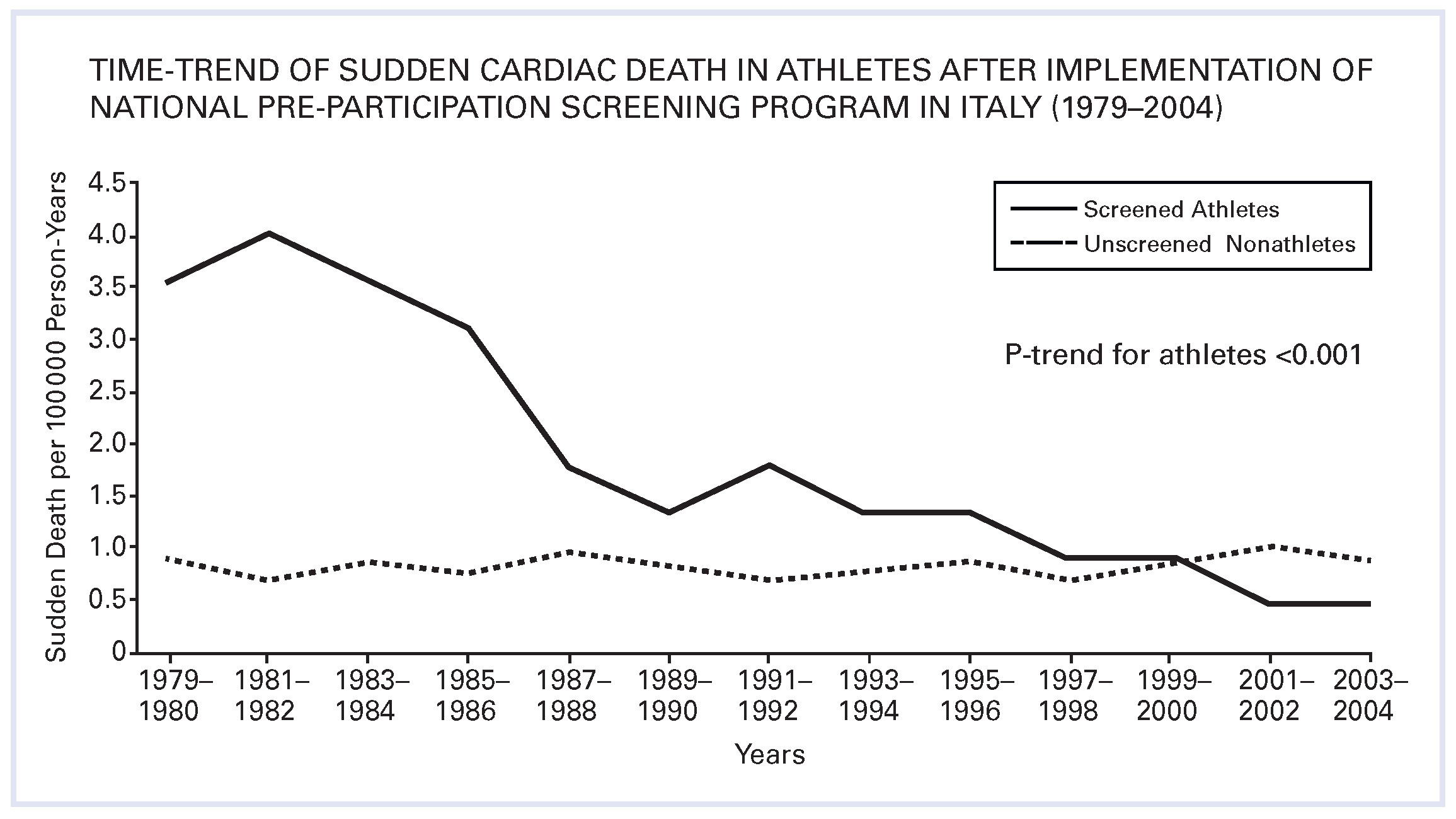 Figure 3). The decline in death rates was primarily from the identification and disqualification of individuals with HCM and ARVC [