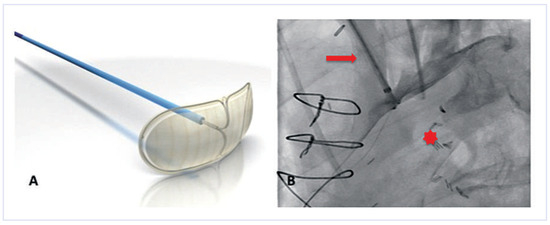 The Embrella device. (A)The device consists of two petals and a delivery cable. (Courtesy of Edwards Lifesciences Ltd., Irvine, CA, USA.). (B) Once positioned at the outer curvature of the aortic arch, a contrast injection through the delivery sheath confirms proper placement. Note that the two petals of the device cover the brachiocephalic trunk and the left carotid artery. Red arrow = brachiocephalic trunk; red star = aortic lumen.