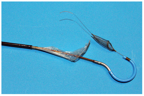 SMT Embolic Deflection Device. The device is introduced by the femoral route. (Courtesy of Keystone Heart Ltd, Herzliya, Israel.).