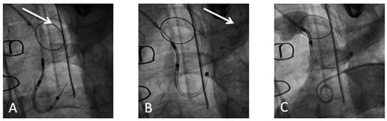 Deployment of the Claret CE Pro™: (A) Deployment of the first filter in the brachiocephalic trunk (arrow). (B) Deployment of the second filter in the left common carotid (arrow). (C) Confirmation of correct device position by contrast injection in the aortic arch.