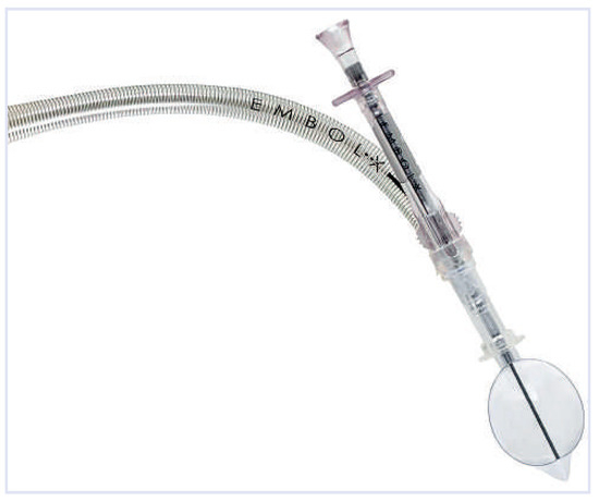Embol-X: The device consists of the delivery system and a basket to be deployed in the aorta. (Courtesy of Edwards Lifesciences Ltd., Irvine, CA, USA.).