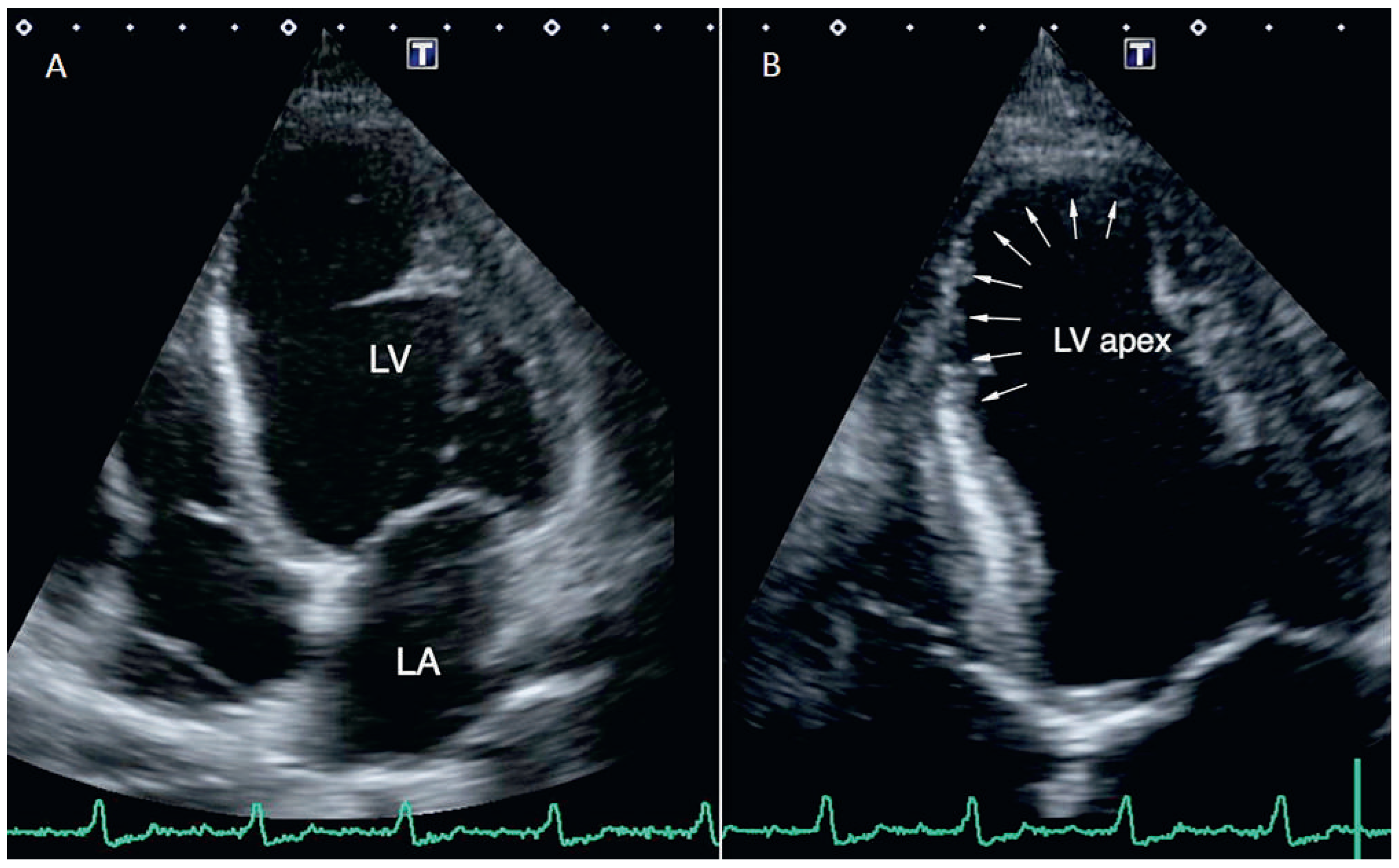 Figure 2. Echocardiography 4-chamber apical view after pacemaker implantation. (A) Dilated cardiomyopathy (enddiastolic freeze-frame). (B) Ventricular aneurysm (arrows) in the apex of the left ventricle (endsystolic freeze-frame). LV = left ventricle; LA = left atrium; LV apex = apex of left ventricle.