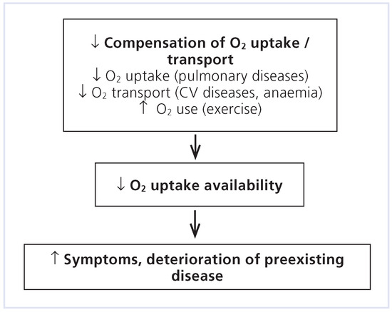 Reduced O2 partial pressure may exacerbate preexisting conditions and patients may become symptomatic at lower levels of exercise or even at rest (Figure 1). Obviously, patients with little exercise capacity at low altitudes are most prone to develop symptoms at high altitudes. Accordingly, the general recommendation is that patients that are symptomatic at low levels of exercise in normoxia should not be exposed to hypoxia.