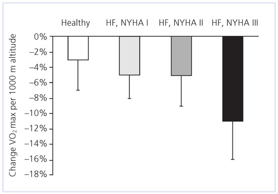 Figure 2. Change in exercise capacity (% reduction per 1000 m altitude) in healthy subjects as compared to patients with different severity of heart failure (HF). (Adapted from [16]: Agostoni P, Cattadori G, Guazzi M, et al. Effects of simulated altitude-induced hypoxia on exercise capacity in patients with chronic heart failure. Am J Med. 2000;109:450–5. © Elsevier, reprint with kind permission.