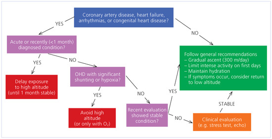 Figure 3. Algorithm if patients with cardiovascular diseases travel to high altitudes. (Adapted from [18]: Higgins JP, Tuttle T, Higgins JA. Altitude and the heart: is going high safe for your cardiac patient? Am Heart J. 2010;159:25–32. © Elsevier, reprint with kind permission.