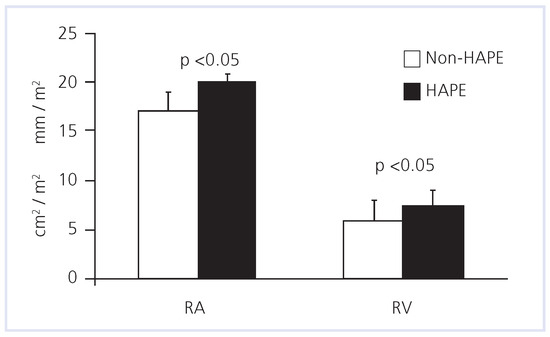 Figure 4. Subjects who are susceptible to develop high-altitude pulmonary edema (HAPE) when staying overnight at altitude of >2500 m show significantly (p < 0.05) dilated right ventricle (RV) and right atrium (RA) as compared to age-matched subjects who tolerated altitude of 4559 m well.