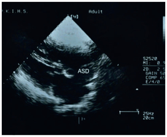 Transthoracic echocardiography revealed ostium secundum atrial septal defect (ASD) with dilated right cavities.