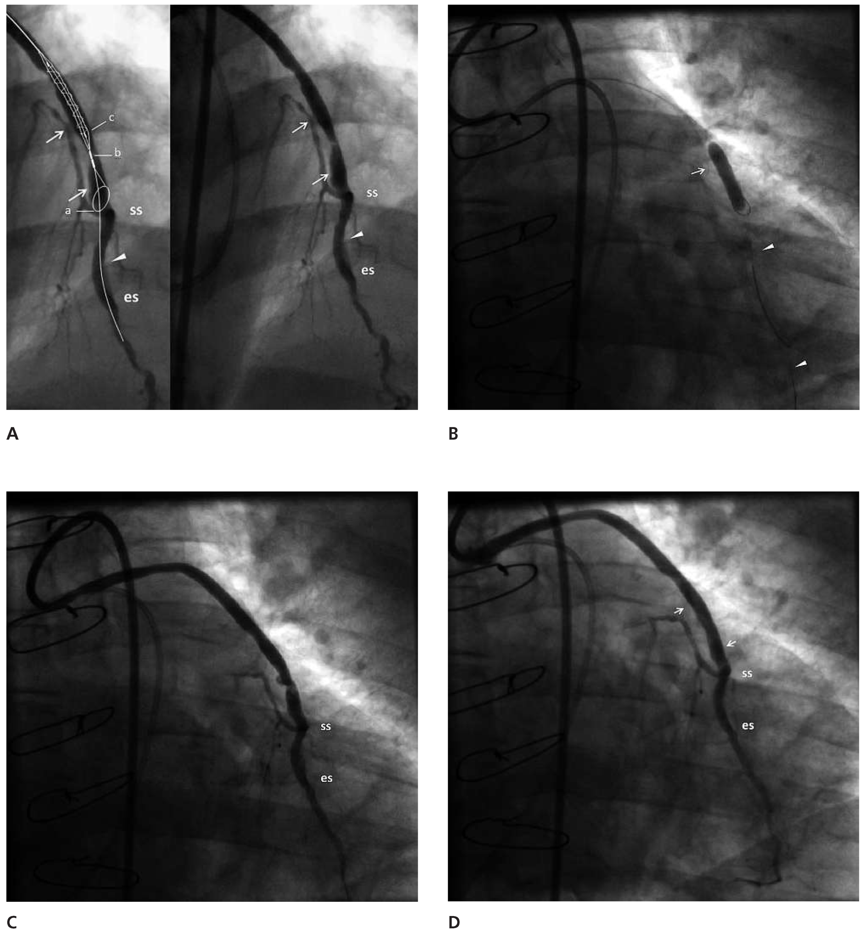 He presented with a NSTEMI with ST segment depression in the lateral leads and small elevation of myocardial enzymes (CK-MB: 48 U/l). Two weeks after his presentation a left ventriculogram demonstrated hypokinesis of the inferior wall and anterior basilar segment and a global ejection fraction of 40%. Coronary arteriography demonstrated severe diffuse stenoses of the left main, intermediate branch and circumflex artery (probably the culprit site, based on the location of the ECG changes) with complete occlusion of the distal circumflex and occlusion of the right coronary artery. The left anterior descending artery was occluded and was diffusely diseased. The only vein graft that was patent was sequentially anastomosed to the mid and distal segments of the left anterior descending artery (LAD), separated by an occluded intervening part. The vein graft borders were smooth but there was a bulky eccentric 70% stenosis close to the side to side anastomosis (
