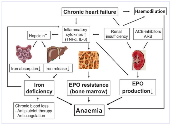 As in other chronic diseases, anaemia in CHF must primarily be considered as an indicator of overall illness. Its pathophysiology is complex and multifactorial (Figure 1. The factors that cause anaemia in CHF patients are subsequently listed by order of their probable contribution.