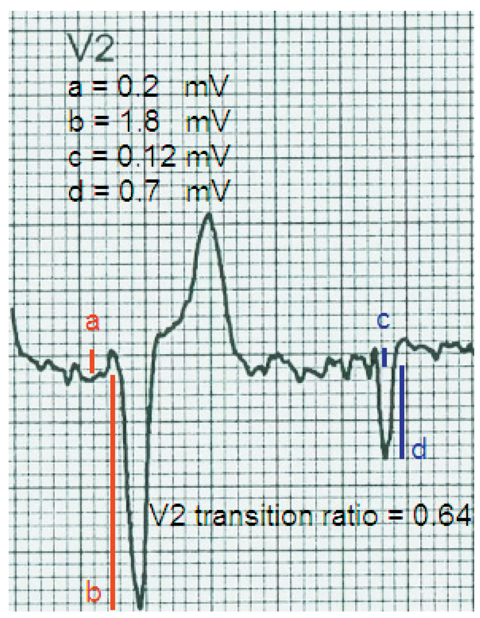 - Betensky, B.P.; Park, R.E.; Marchlinski, F.E.; Hutchinson, M.D.; Garcia, F.C.; Dixit, S.; et al. The V(2) transition ratio: a new electrocardiographic criterion for distinguishing left from right ventricular outflow tract tachycardia origin. J Am Coll Cardiol. 2011, 57, 2255–2262. [Google Scholar] [CrossRef] [PubMed]