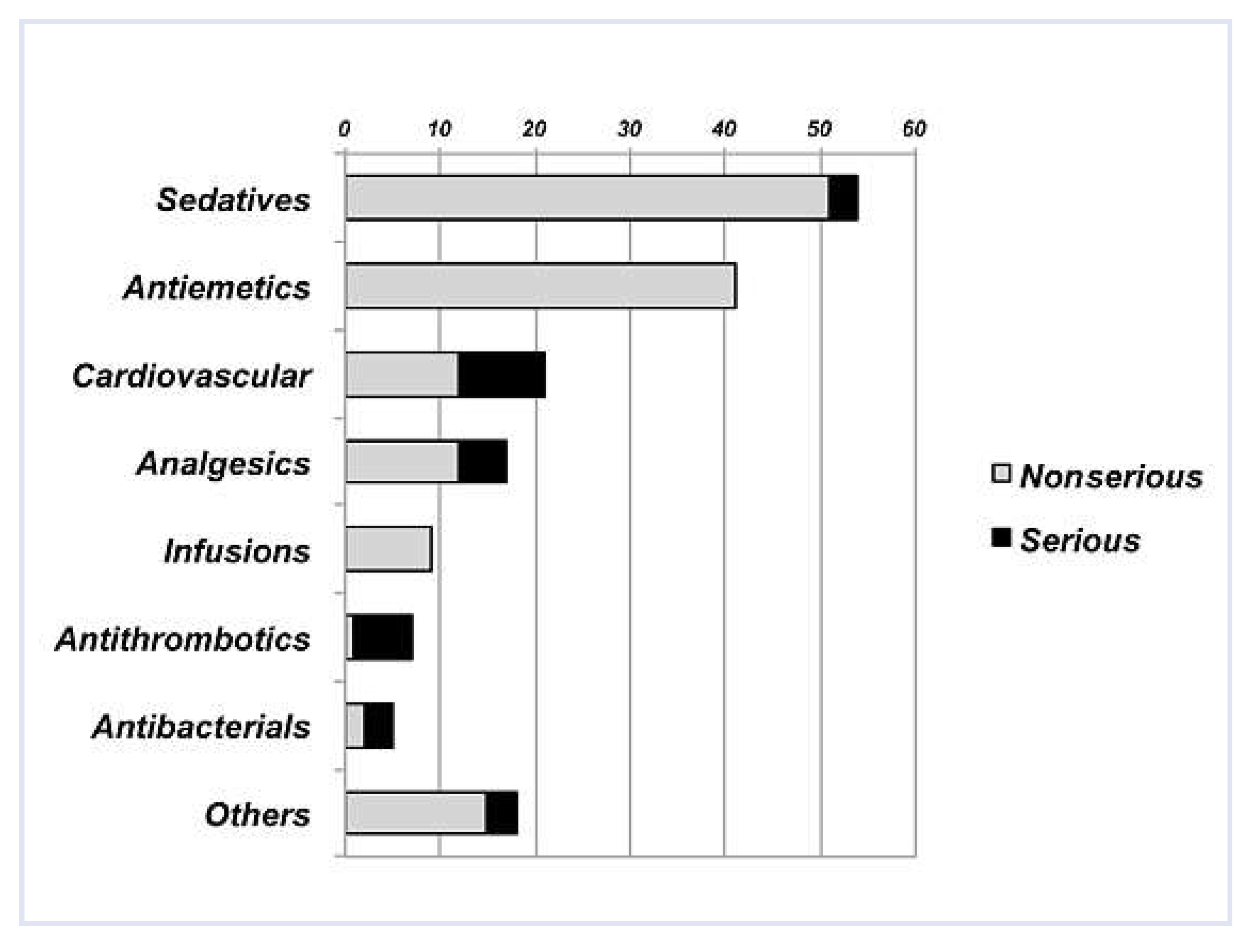 13] as serious and nonserious errors: an error was considered clinically significant if it potentially results in an ADE. It was considered serious if it was likely to result in the need for additional therapeutic activities, a prolonged hospital stay, the need for an intensive care unit or surgery, or if it could be fatal. Remaining errors were classified as nonserious. Patients aged over 80 were screened for potential paradoxical reactions to benzodiazepines [
