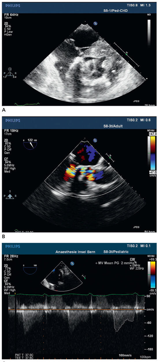 3 Post-implantation echocardiography shows optimal position of the transcatheter valve in the mitral anulus by intraoperative epicardial (A) and postoperative TEE examination with unobstructed LVOTO and in the color doppler unobstructed flow to the aortic valve (B). Assessment of the transprothetic mean pressue gradient at the end of the procedure (C).