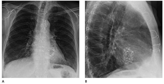 Antero-posterior (A) and lateral (B) chest X-ray demonstrates position of the transcatheter Sapien valve.