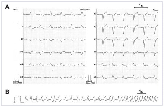 A. Surface 12-lead resting ECG. This ECG shows 1st degree atrioventricular block and complete left bundle branch block. B. Rhythm-ECG during monitoring in the intermediate care unit. The clinical tachycardia started after two premature beats and led to presyncope in supine position. This tachycardia is a regular wide-QRS tachycardia; the QRS morphology is apparently unchanged compared to sinus rhythm.