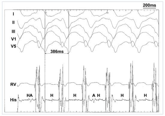 Figure 1 shows wide-QRS complex tachycardia with an apparently unchanged QRS complex compared to sinus rhythm; supraventricular tachycardia with preexisting bundle branch block, preexcited tachycardia and ventricular tachycardia are the differential diagnoses. In the electrophysiology study, the patient showed a markedly prolonged AH interval (176 ms) and HV interval (86 ms); during atrial stimulation, there was no preexcitation, and atrioventricular Wenckebach block occurred at a cycle length of 600 ms. The clinical tachycardia (Figure 2) could reproducibly be induced with programmed ventricular stimulation. Ventriculoatrial dissociation was present, favouring ventricular tachycardia and excluding AV reentry tachycardia. During tachycardia, the His bundle deflection was preceding each QRS complex, suggesting the involvement of the His-Purkinje system in the tachycardia mechanism. Entrainment mapping in the right ventricular apex showed short post-pacing intervals (30 ms), indicating the right ventricular apex as part of the reentry circuit of the tachycardia. The diagnosis of bundle branch reentrant tachycardia was made.