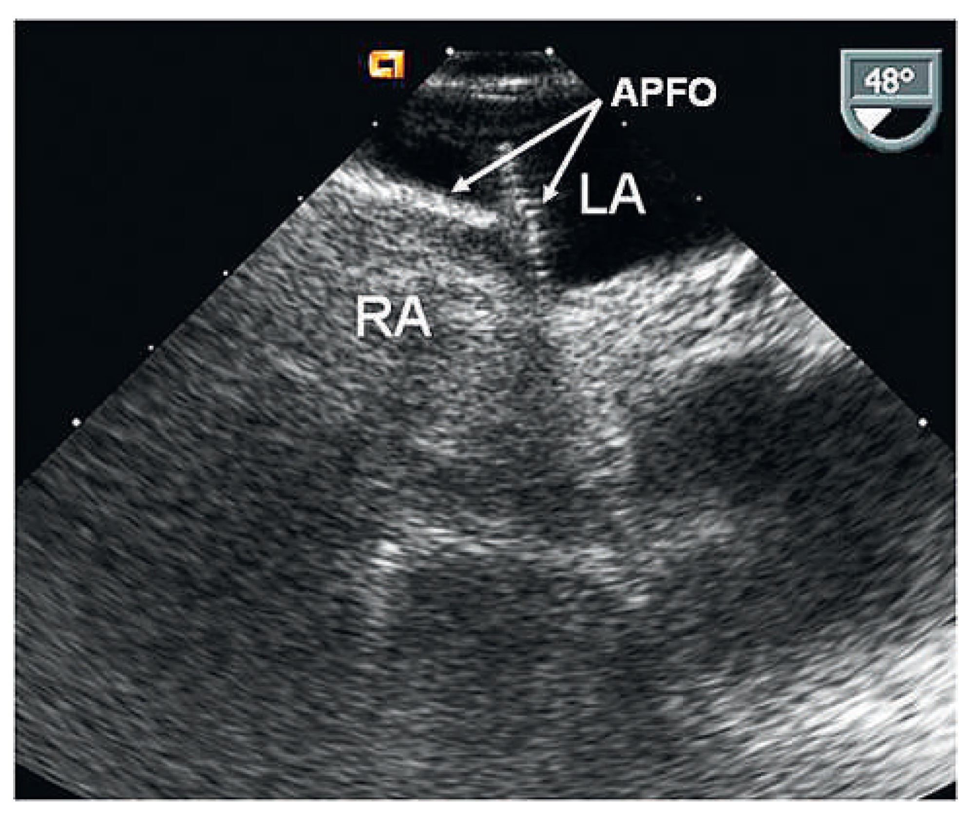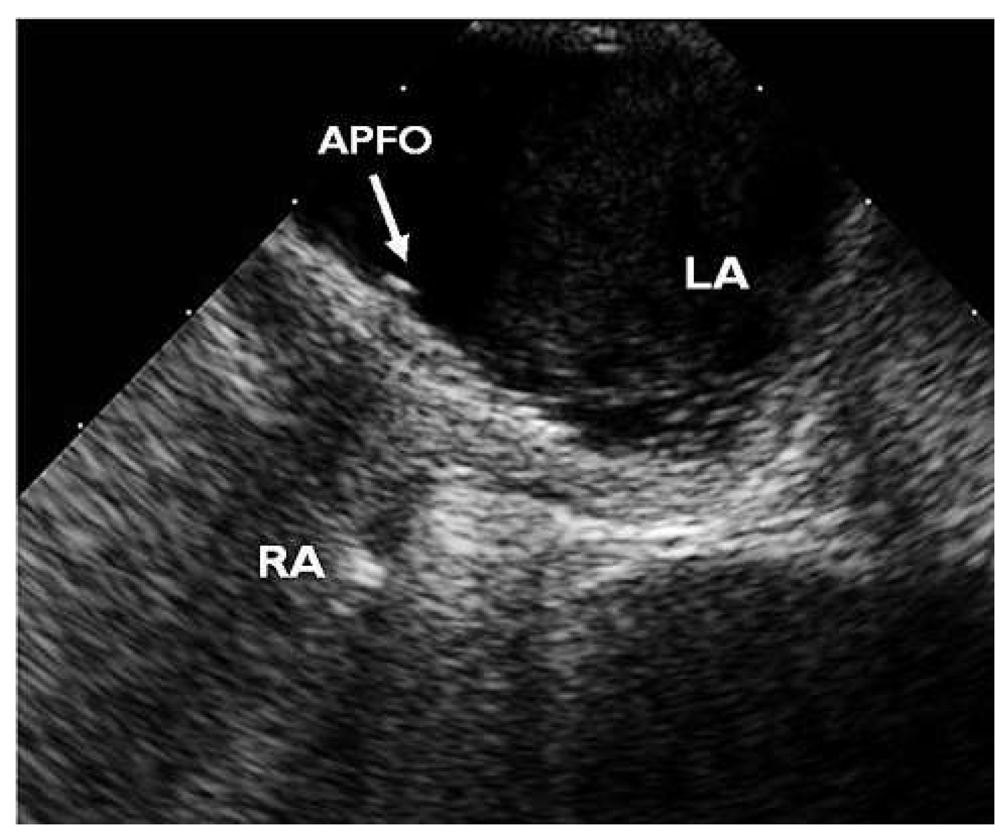 Figure 6. Final contrast TEE showing complete occlusion 6 months after the third intervention. APFO = left disks of first (left) and third (right) PFO Occluders; LA = left atrium; RA = right atrium.