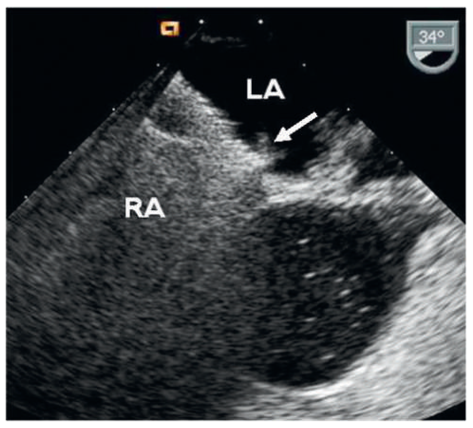 Figure 4. Contrast TEE 6 months after implantation of the second device with residual shunt grade 2 (arrow). LA = left atrium; RA = right atrium.