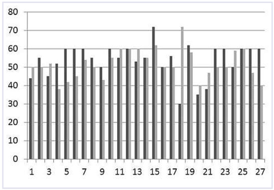 Individual changes in left ventricular ejection fraction between baseline and last follow-up. Axis shows the 27 patients, y-axis left ventricular ejection fraction. Black bars: baseline; Grey bars: last followup.