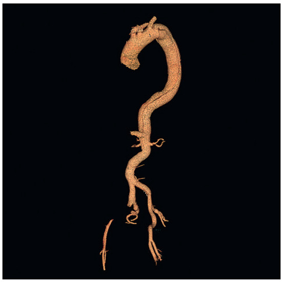 - Williams, D.M.; Lee, D.Y.; Hamilton, B.H.; Marx, M.V.; Narasimham, D.L.; Kazanjian, S.N.; et al. The dissected aorta: part III. Anatomy and radiologic diagnosis of branch-vessel compromise. Radiology. 1997, 203, 37–44. [Google Scholar] [CrossRef] [PubMed]
