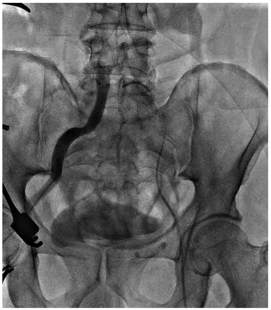 Angiogram of the right iliac artery after stent placement showed the flow in the right iliac artery restored.