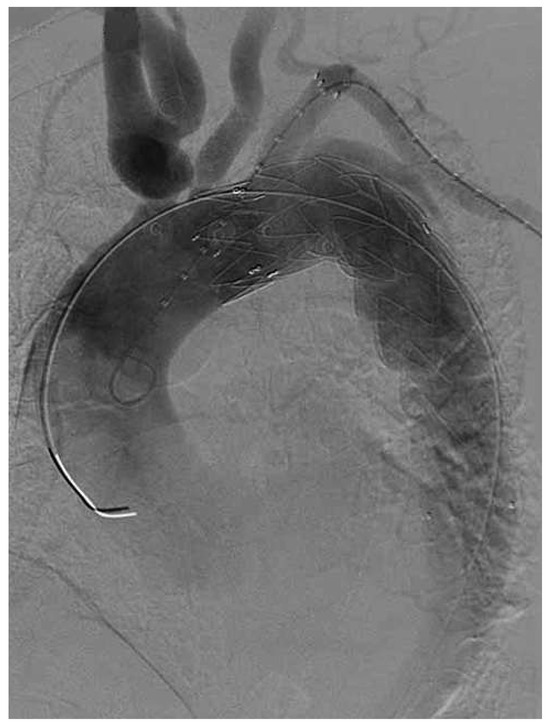 After endovascular repair of the descending aorta and fenestration of the left subclavian artery, an aortogram showed the correct sites and shapes of the two stents.