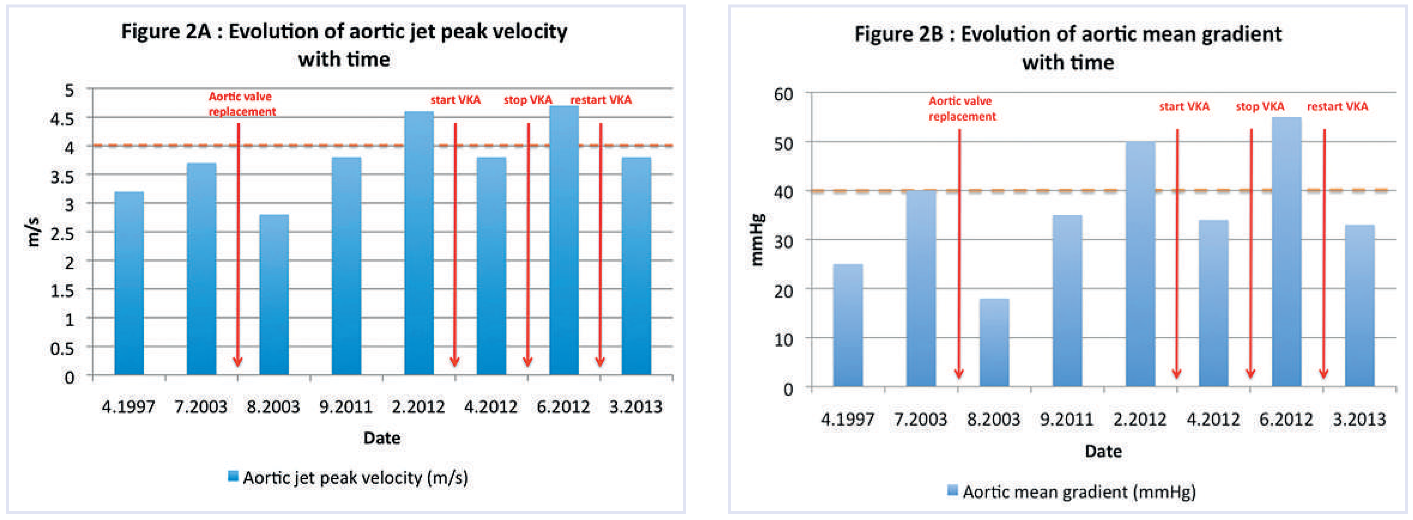 After 2 months of effective anticoagulation with international normalised ratio (INR) values between 2 and 3, peak velocity and mean gradient had decreased to 3.8 m/s and 34 mm Hg, respectively, and the EOA was 1.6 cm2 (0.8 cm2/m2) Despite resolution of the dyspnoea, the patient was extremely reluctant to continue the anticoagulation, and it was decided to interrupt the treatment and check the echocardiogram 2 months later in order to confirm the benefit of the acenocoumarol and its indication. The follow-up echocardiogram showed once again increased obstruction (peak velocity 4.7 cm/s, mean gradient 55 mm Hg, EOA 1.1 cm2 or 0.55 cm2/m2), without any significant visual changes on two-dimensional imaging. Because of a significant reduction in his physical activity, the patient had remained asymptomatic during these 2 months. He then accepted longterm oral anticoagulation in order to be able to start exercising again, and so far the function of the bioprosthesis remains stable (latest values (the patient then being 56 years old): peak velocity 3.8 cm/s, mean gradient 33 mm Hg, EOA 1.4 cm2 or 0.7 cm2/m2). He remains asymptomatic.