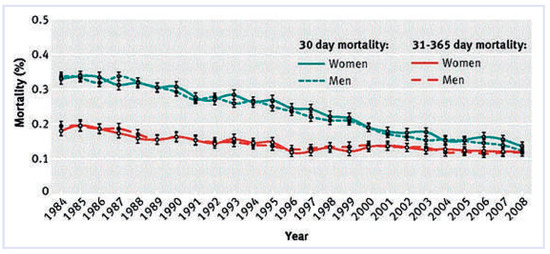 Change in short and intermediate term mortality after ST elevation myocardial infarction. Standardised 30 day and 31–365 day mortality after first hospitalisation for myocardial infarction among men and women between 1984 and 2008 in Denmark.33 Reprinted with permission from BMJ Publishing Group.