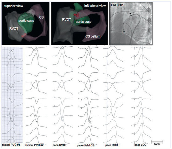 - Tanner, H.; Hindricks, G.; Schirdewahn, P.; Kobza, R.; Dorszewski, A.; Piorkowski, C.; et al. Outflow tract tachycardia with R/S transition in lead V3: six different anatomic approaches for successful ablation. J Am Coll Cardiol. 2005, 45, 418–423. [Google Scholar] [CrossRef] [PubMed]