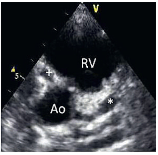 2D echocardiography (* = LAD aneurysm, + = right coronary artery aneurysm).