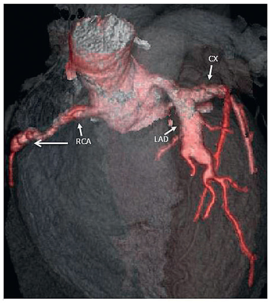 3D-computed tomographic reconstruction showing aneurysms of the left anterior descending (LAD), the left circumflex (CX) and the right coronary artery (RCA).