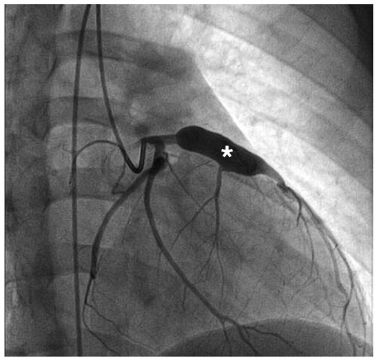 Coronary angiography with partial remodelling six months later. Only the left anterior descending artery aneurysm (*) persists.